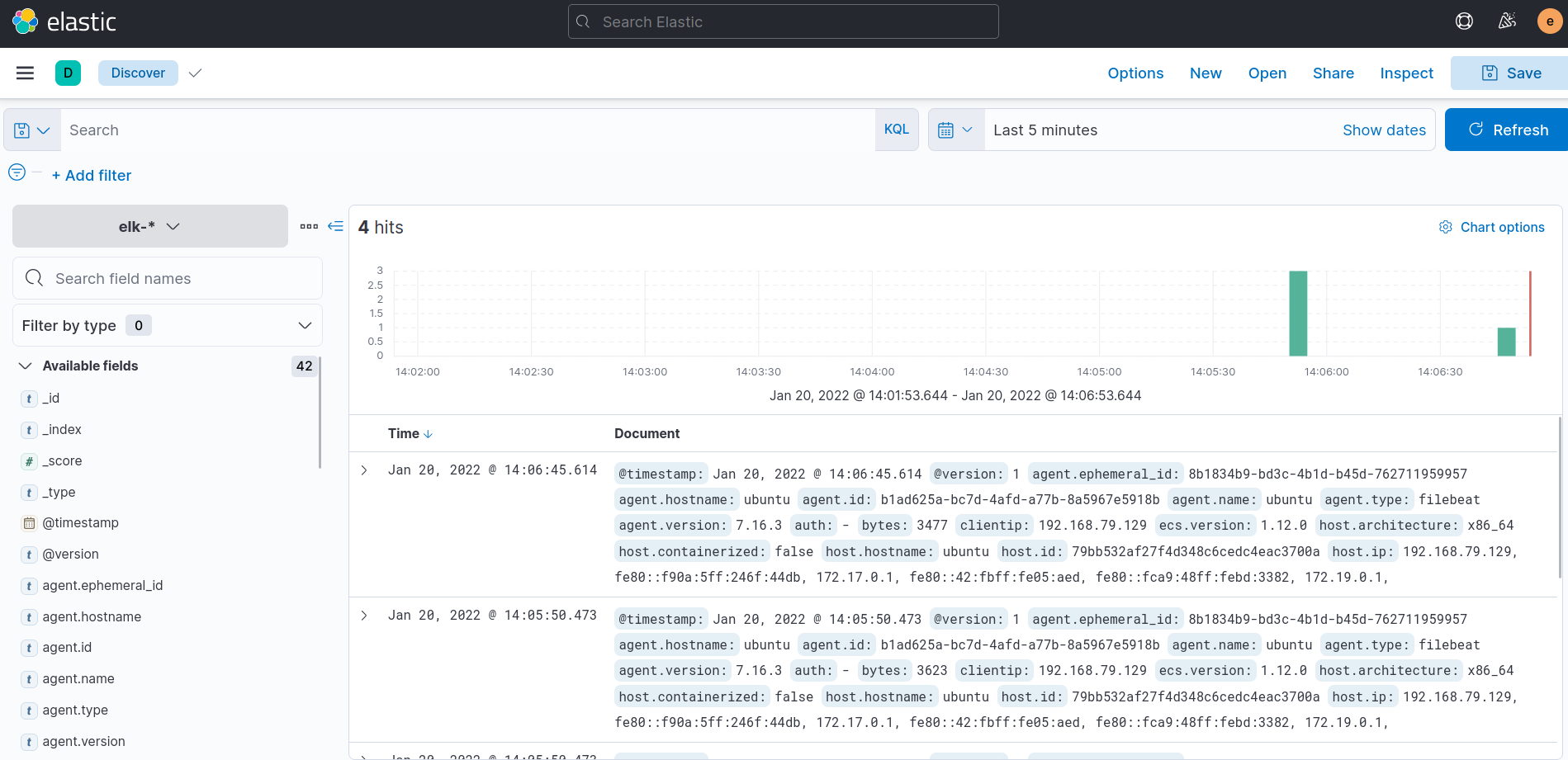 나의 경우 logstash pipeline설정에서 elasticsearch 설정 index => "elk-%{+YYYY.MM.DD}"로 해놨기때문에 각 로그의 날짜가 찍혀 elasticsearch index 로 추가된다. kibana에서 index pattern을 설정해줄때 elk-*로 해줬고 discover 창에서 보면