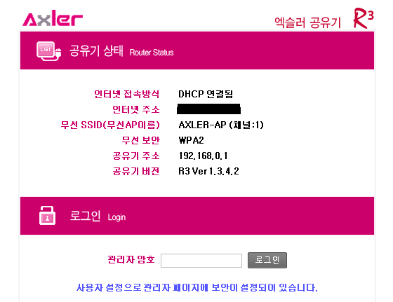 저의 기준으로 기본 게이트 웨이 주소인 192.168.0.1에 들어가면 이렇게 공유기의 기종별로 관리자 페이지가 나옵니다.