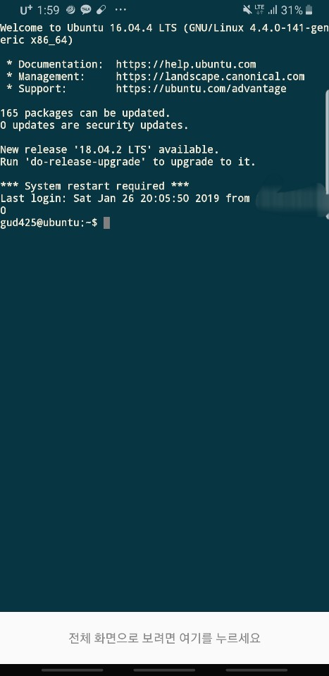 핸드폰에서 데이터를 키고 ssh앱으로 vmware의 linux에 접속한 모습입니다.