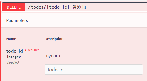 - params: dict 객체를 받으며, 키로는 파라미터 변수명, 값으로는 설명을 적을 수 있습니다.