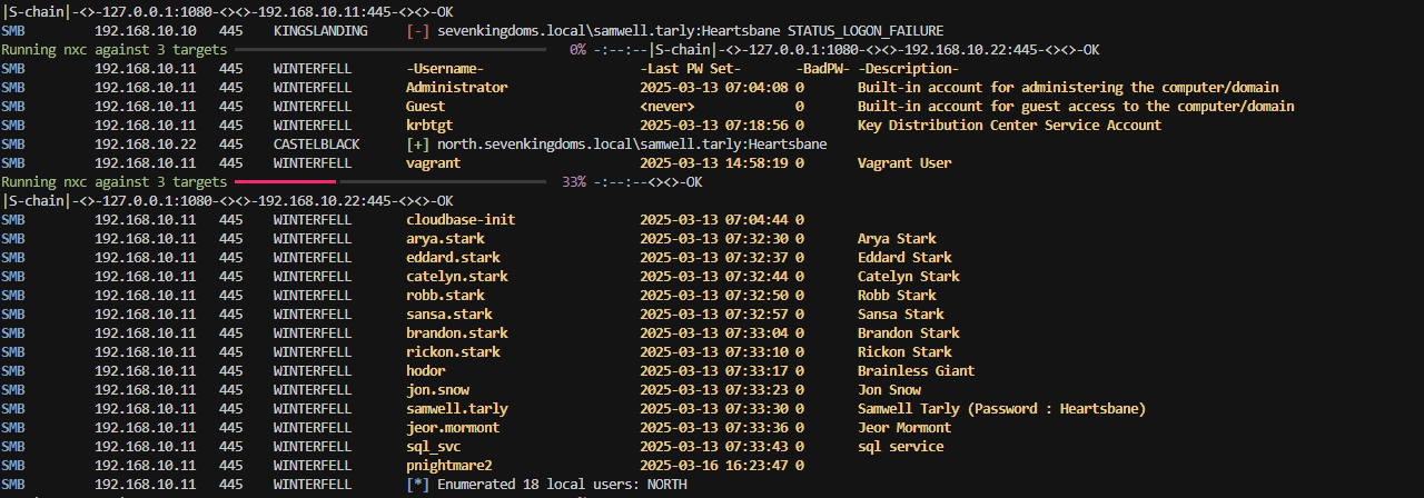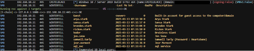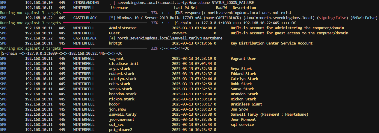 sudo proxychains /home/nam/.local/bin/nxc smb ips.txt -u 'samwell.tarly' -p 'Heartsbane' --users