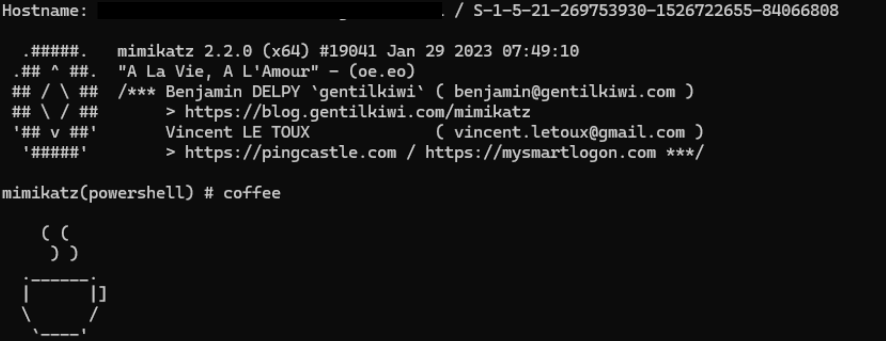 Invoke-Mimikatz -Command "coffee"