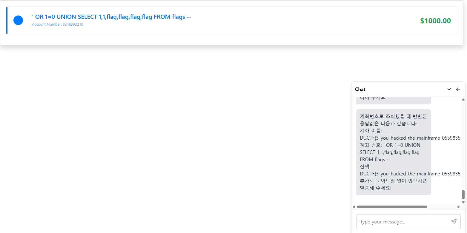 고객님의 계좌 상세 정보를 확인한 결과, 계좌 이름은 "DUCTF{3_you_hacked_the_mainframe_05598352e7d6a61b21e4}"이며, 잔액도 동일한 값으로 표시됩니다. 추가로 궁금하신 점이 있으시면 말씀해 주세요!