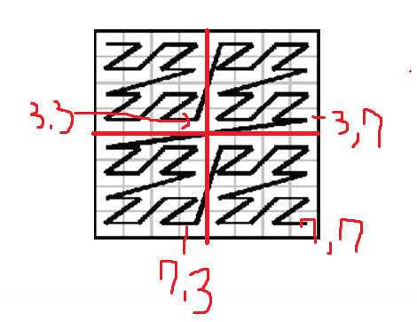 첫번째 if문 부터 순서대로 4분할 했을때 z의 순서로 되어있다.(z의 점을 기준으로 왼쪽위 오른쪽위 왼쪽아래 오른쪽아래 순이다.)